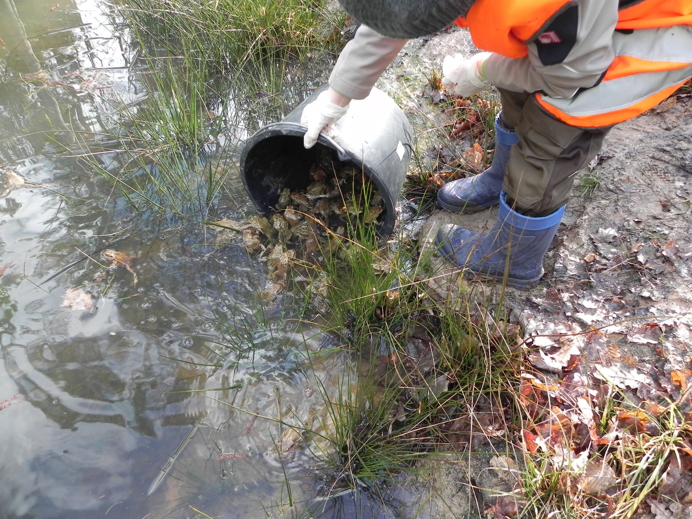 Es gilt Kröte und Co. an ihr neues Zuhause zu gewöhnen! Das wird gar nicht so einfach sein, denn die Tiere werden wohl nach dem Einbringen in ihr neues Laichgewässer zumeist unmittelbar dorthin hüpfen, wo sie auch aufgewachsen sind, nämlich ihre altbekannten Fischweiher, auch wenn diese abgelassen wurden und sich nur noch schlammige Tümpel mit etwas Wasser gebildet haben.