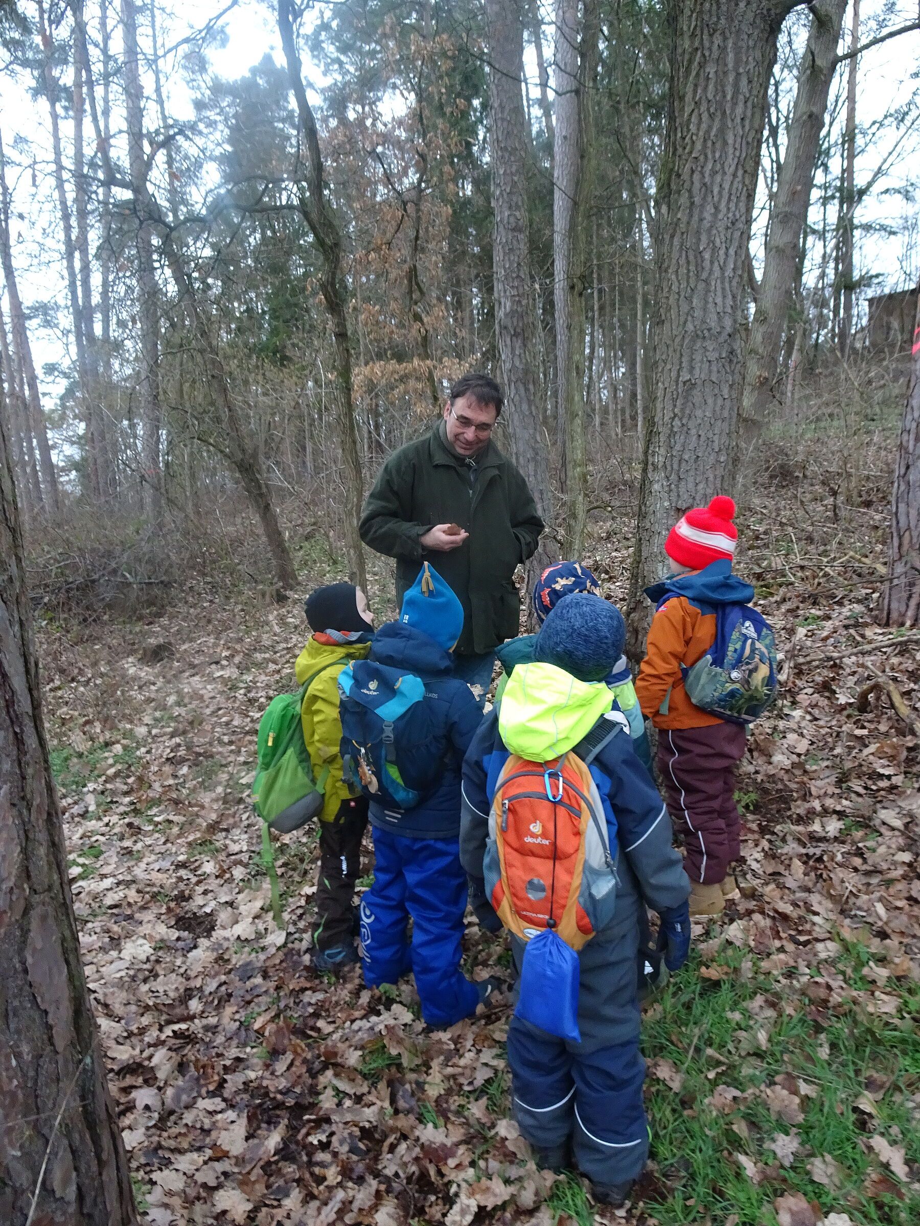 Foto (Melanie Spiegel): Die Rohrer Waldkindergartengruppe „Eichhörnchen“ unterwegs mit BN-Waldexperten Ralf Straußberger