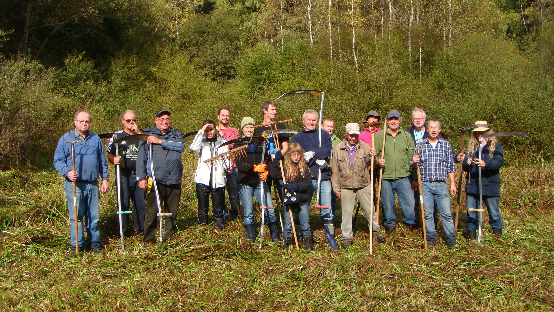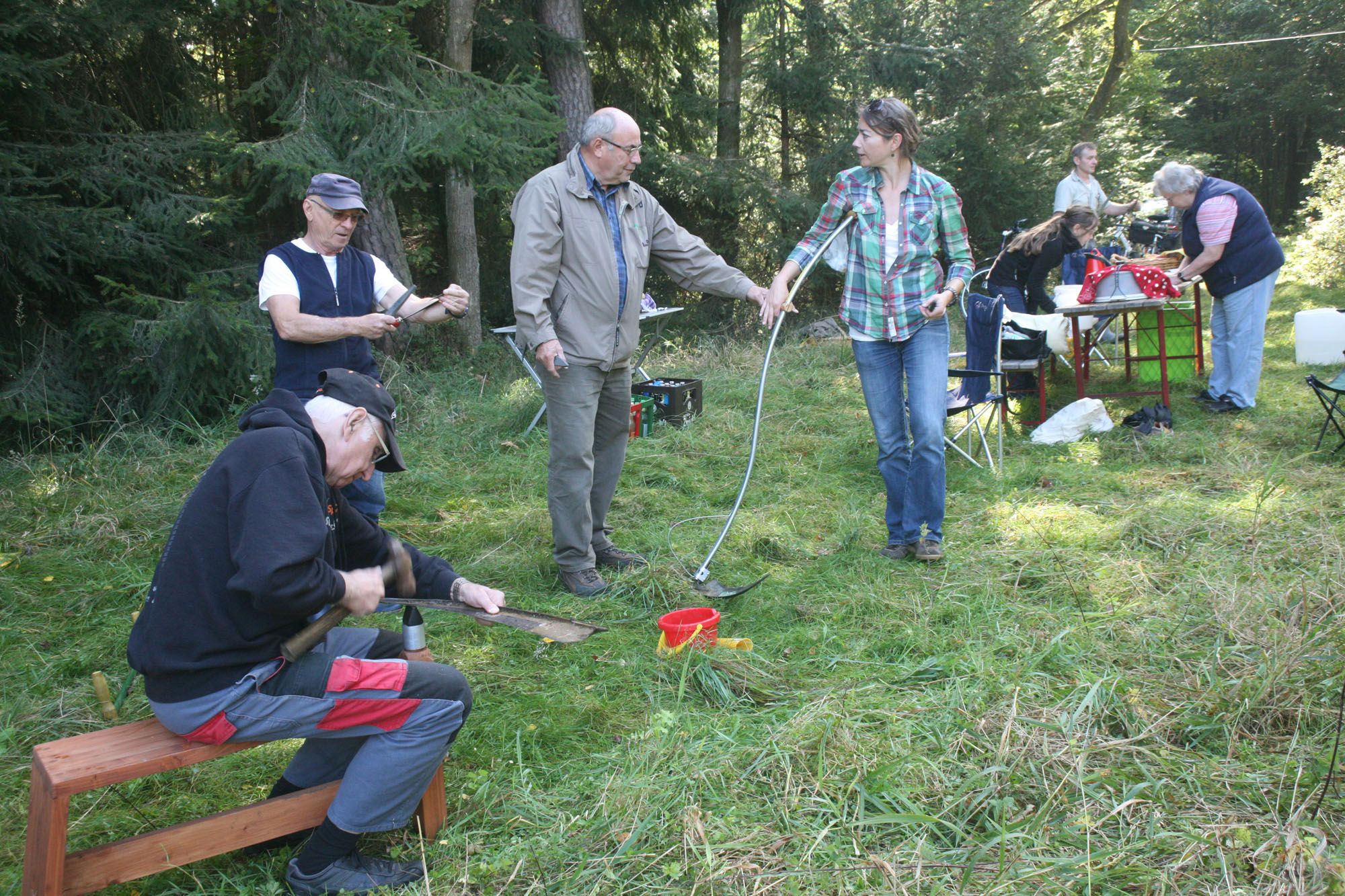 Die Bund Naturschutz (BN) Ortsgruppe Wendelstein hatte zum Sensenkurs mit anschließender Biotopflege eingeladen. Trotz unsicherer Wetterlage waren pünktlich um 10 Uhr 15 Naturschützer erschienen, um sich vom BN ‚Sensenmann‘ Ludwig Wiedenhofer in die Kunst des Sensenmähens, Dengelns und Wetzens einweisen zu lassen.